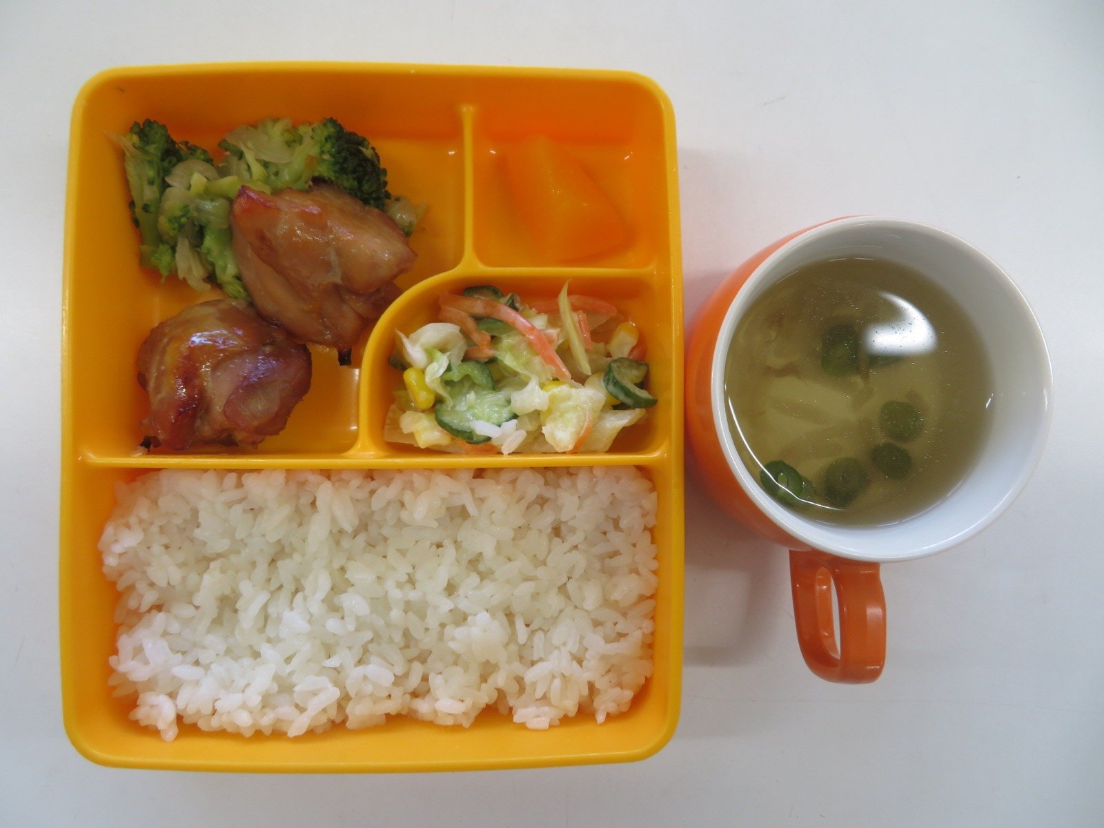 ごはん鶏肉のマーマレード焼きブロッコリーソテーコールスローサラダコンソメスープ・フルーツ