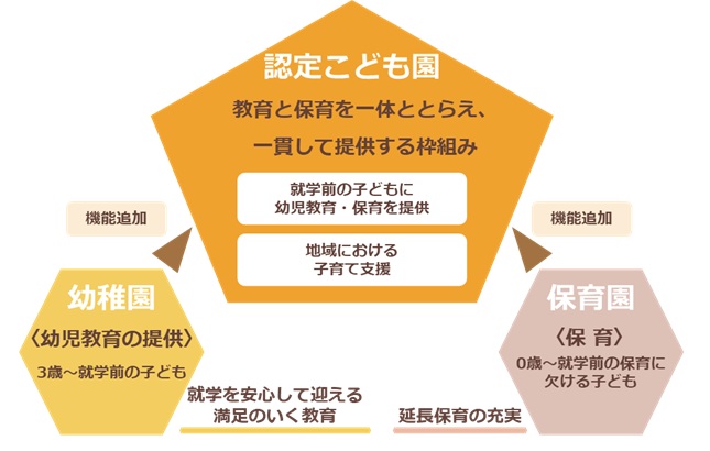認定こども園とは、幼稚園と保育園の機能を併せ持つ施設です。また、地域の子育て支援を行うなど、地域の幼児教育機関の中心的な施設として、都道府県から認定された園のことをいいます。