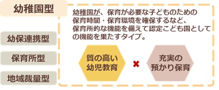 「幼稚園型」は、認可幼稚園が“保育が必要な子ども”のために保育時間を確保し、保育所としての機能も備えたタイプです。